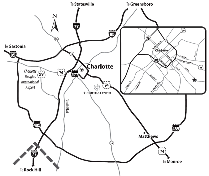 Take I-85N to Exit 36/Brookshire Frwy./Hwy. 16 South. Take Exit 2B (bearing left) onto Hwy. 74 East/Independence Blvd. Take Briarcreek Rd. Exit. Turn left at the top of the ramp. Turn right onto Monroe Rd. at stoplight. (Monroe Rd. turns into 7th St.). The office is located on the left at 2610 East 7th St. in the Eastover Medical Park.